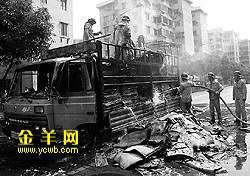 記者接到報料后在下午1時30分趕到現場時,消防車和警車已在場,大批警察正在維持現場秩序。一輛車牌為粵Y00825的南海籍貨車被燒毀停在路面中央,車頭被燒得只剩下一個鐵殼,擋風玻璃燒熔了一地,左后車輪胎也被燒爆。該貨車上雖不見明火,但撲救的消防員仍在向車上冒煙的紙堆里灌水,有的消防員甚至在車上用鐵耙將燒焦的紙堆鉤出扔到路面上。在現場路面上隨處可見被燒毀的紙張,黑乎乎的紙灰飄落在積水上。