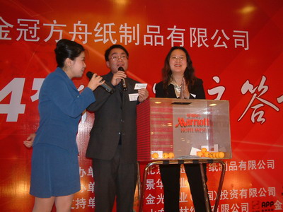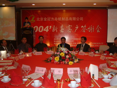 (景華紙業網獨家報道 記者何玲)元月6日,北京金冠方舟紙制品有限公司在北京金域萬豪酒店召開2004年新春客戶答謝會,公司總經理朱勇先生出席大會向各位新老客戶恭祝新春快樂并作了精彩發言。此次答謝會由金冠方舟紙制品有限公司主辦,景華紙業網協辦,支持單位為:金光紙業集團、大宇制紙、泉林集團和金華盛紙業。全國各地的客戶、經銷商等眾多嘉賓參加了答謝會。