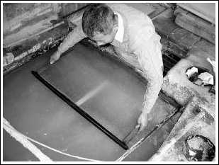 記者問馬勝松:“現在還有沒有人會用手工方法造紙?”他笑了,說:“當然有了,我現在還經常造著呢。”說著,他便系緊圍裙跳進緊挨紙槽,只能容下一人站立的小坑中撈起紙來。只見他先用一根木棍在紙槽中輕輕攪動,等沉淀在下面的紙漿均勻地漂浮在水中后,再拿起紙槽邊的竹簾,放在一個大小與之匹配的木框上。接著,他雙手托住木框,將框邊以約30度斜角插入水中十厘米左右,稍停頓一下又麻利地從水中抽出。