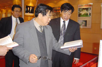 曾曉東在榮譽展室翻看由華泰專用紙印刷的《江澤民論有中國特色社會主義》、《論“三個代表”》等書籍