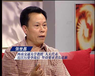張世昌:我是這樣看,他對(duì)上級(jí)政府,直到對(duì)國(guó)務(wù)院領(lǐng)導(dǎo)做檢討,那是對(duì)的,對(duì)上級(jí)負(fù)責(zé),同時(shí)副省長(zhǎng)在向人大報(bào)告的時(shí)候,代表省長(zhǎng)向受災(zāi)的群眾道歉,我覺(jué)得這也是對(duì)的。但是這一次污染,直接受到損害的是這一百萬(wàn)群眾,但是從整個(gè)生態(tài)環(huán)境來(lái)講,它應(yīng)該說(shuō)是對(duì)整個(gè)四川影響很大,包括我在內(nèi),僅僅是在飲水這個(gè)問(wèn)題上我們沒(méi)有直接受到影響,從環(huán)境的各個(gè)角度講,因?yàn)槲覀內(nèi)松嬉粋(gè)是水、空氣、陽(yáng)光,那是人類生存和生活的三大基本環(huán)境要素。整個(gè)生態(tài)環(huán)境受到影響的話,不僅僅就是說(shuō)靠喝桶裝水能夠解決的,也不僅僅是他們回避,我不吃沱江水就完了,所以我覺(jué)得這個(gè)事情應(yīng)該提高到這個(gè)層面來(lái)看,沱江是(四川)人民的。