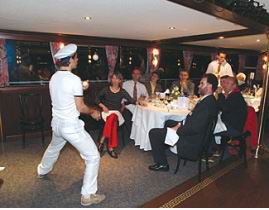 第二天晚上的節(jié)目是泛舟美麗的多瑙河,各國嘉賓們在豪華的游艇上邊享用豐盛晚宴,邊欣賞沿河的美景,隨著習習夜風,有著名的藍色多瑙河圓舞曲的一路陪伴,間或欣賞席間的小表演和雜耍,貴賓們充分感受到了Voith人的熱情。