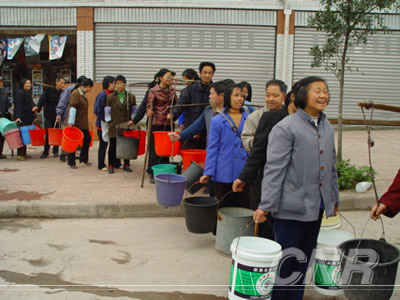 沱江污染后,當地群眾排隊到消防車接水喝