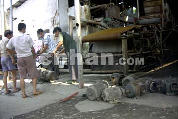 為一探究竟,記者佯裝談生意,進入廠區。從門口至廠內,記者未發現任何造紙廠標牌,數千平方米的廠區內,堆滿廢紙箱及破布等造紙原料。一位自稱三閘造紙廠的負責人介紹,廠里主要生產瓦楞紙,月產可達200多噸。在他的指點下,記者來到廠區一隅的生產車間,一臺造紙機放在石棉瓦搭成的鐵棚下,造紙機上還粘著新鮮的紙漿,機器旁堆著十幾卷成品紙。十幾個工人正在一小房內休息。找遍廠區,未見污水凈化設備。
