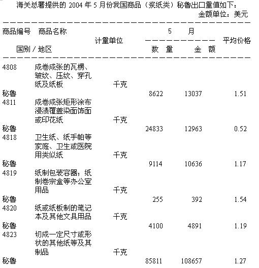 5月我國商品(漿紙類)秘魯出口量值表