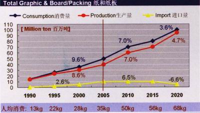 據預計,到2020年,文化紙消費總量將高達3700萬噸,紙板和包裝紙消費總量將高達6300萬噸。由此所知,在未來的十多年內,中國對紙和紙板的需求量還將保持強勁的上升趨勢。