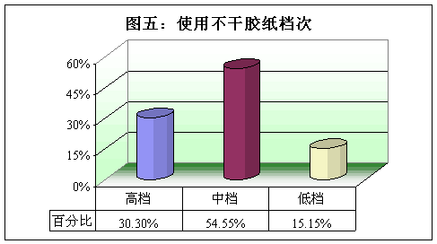 隨著近幾年不干膠紙產品的快速發展,高檔不干膠紙的市場占有率也在逐步增加。從本次調查數據結果顯示,有三成的企業主要使用高檔不干膠紙。相信隨著我國經濟的不斷發展和人們生活水平的提高,人們對于產品質量的要求也會越來越高,高檔不干膠紙的市場份額還將進一步得到提高。