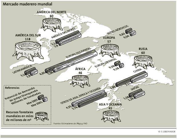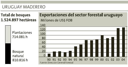 烏拉圭的人工林主要集中在RIVERA、TACUAREMBO、RIONEGRO、PAYSANDU以及東部山地。桉樹(GLOBULUS和GRANDIS兩個品種)和松樹占了80%。GLOBULUS按樹10年后就可砍伐,而GRANDIS按樹和松樹則在生長15-20年后方可成材。烏拉圭現(xiàn)有的人工林從2006年開始可以成片砍伐。