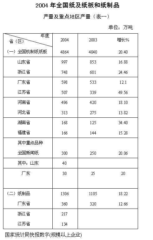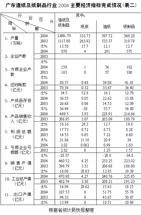 2004年,根據省統計局對規模以上291家造紙企業統計,機制紙及紙板產量598萬噸,增長12.1%;工業總產值240.76億元,增長15.63%;銷售收入233.25億元,增長12.85%;利潤8.73億元,增長20.9%。去年,雖然遇到電力、原材料緊缺、漲價的強大壓力,第一次出現低于全國平均發展速度的情況,由于企業加強內部管理,改善經營,利潤增幅大大超過全國平均增長12.51%的水平。出口產值完成51.75億元,增長18.51%。造紙工業產值、銷售收入、產量居全國同行第三位,利潤和出口產值分別居全國同行第五位和第一位。重點品種新聞紙,完成30.42萬噸,比上年增長22.83%,居全國第二位。