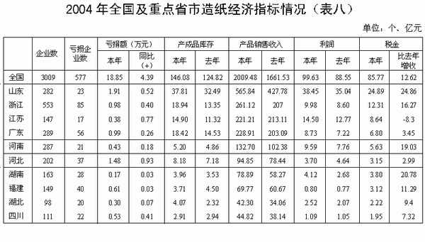 6、主要經濟指標完成情況 根據省統計局對2004年規模以上295個制漿造紙企業的統計(其中制漿4家),紙及紙板總產量598萬,較上年增長12.1%,商品紙漿12.5萬噸,較上年增長25%。工業總產值245.07億元,比上年增長16.71%(其中造紙240.76億元,增長15.63%)。產品銷售收入232.84億元,比上年增加12.94%(其中造紙228.91億元,增長12.7%);利潤9.45億元,比上年增加20.08%(其中造紙8.73億元,增加20.09%);出口產值造紙51.75億元,比上年增加18.51%;應收賬款39.56億元,比上年增加16.39%;產成品庫存22.67億元,比上年增加55.38%。以上數據說明2004年市場競爭激烈,由于出口產品增速放慢,紙制品增速放慢,導致產成品庫存大幅增加。