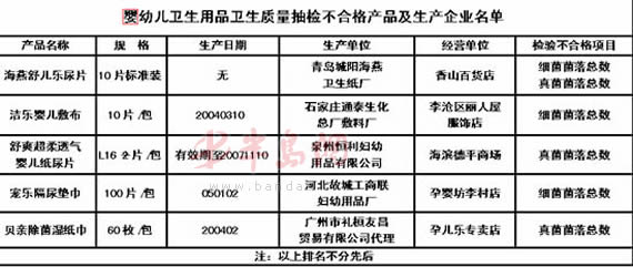 三成嬰幼兒衛(wèi)生用品質(zhì)量不合格,嚴重的竟然細菌超標(biāo) 13倍!今天下午,市衛(wèi)生局公布了六一大檢查中劣質(zhì)嬰幼用品的黑名單。 “紙尿褲等嬰幼用品質(zhì)量不達標(biāo),對嬰幼兒的傷害極大。”市衛(wèi)生監(jiān)督所有關(guān)負責(zé)人告訴記者,由于紙尿褲等直接與皮膚接觸,而且嬰幼兒的肌膚滑嫩,劣質(zhì)產(chǎn)品很容易造成過敏、濕疹等不良反應(yīng)。六一國際兒童節(jié)即將來臨,為保障島城嬰幼兒使用上安全放心的衛(wèi)生用品,市衛(wèi)生局近日開展了六一嬰幼兒衛(wèi)生用品專項檢查。執(zhí)法人員重點對全市的中小型商場和嬰幼兒用品專賣店進行了檢查,并對22種嬰幼兒紙尿褲(墊、片)、濕巾采樣送檢。
