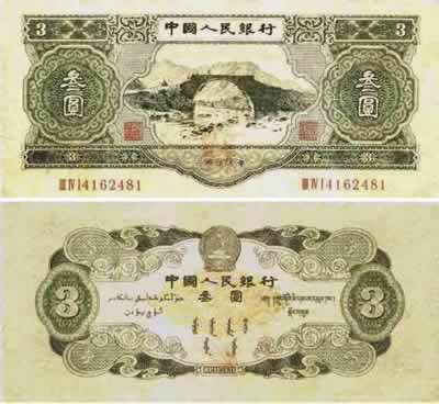 在咨詢有關收藏專家后得知,這種面額為3元的人民幣是第二套人民幣中的一種,1953年印刷,1955年3月正式發行,是蘇影三種票”中的一種。在市場上流通了9年以后,因政治原因在市場上停止流通,被國家收回,因此,這樣的紙幣在民間的數量十分稀少,也因此具有很高的收藏價值。
