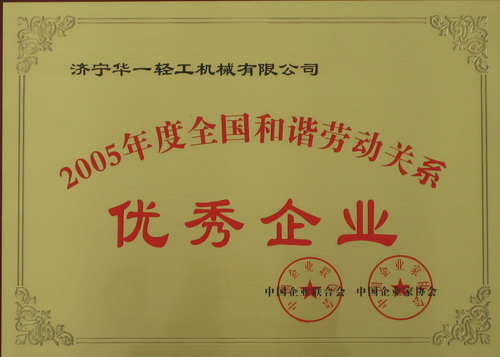 (中國紙網通訊員郭慶立報道)10月15日,濟寧華一輕工機械有限公司被中國企業(yè)聯(lián)合會、中國企業(yè)家協(xié)會授予“2005年度全國和諧勞動關系優(yōu)秀企業(yè)”榮譽稱號;并頒發(fā)了獎牌和榮譽證書。這是華一公司繼今年5月榮獲“全國模范職工之家”榮譽稱號之后,又獲得一國家級殊榮。