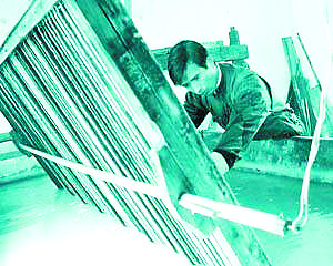 用簾架將已分解均勻的紙漿撈起,紙漿充分地吸收在模具上,一張桑皮紙已初步成形。此時再送往烤房內用火焙干,成品桑皮紙就這樣造出來了。