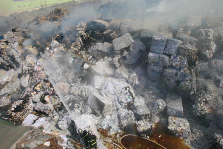 據(jù)介紹,雖然火情已經(jīng)得到基本控制,但是仍需持續(xù)地往廢紙堆中噴水。“紙堆表面已經(jīng)結起了一層白色的炭狀物,可是在表層下仍很清楚地看到暗紅色的火焰,如果沒有周邊水槍、水炮的壓制,立馬會死灰復燃。”一位在現(xiàn)場的消防隊員告訴上海東方早報記者。此外,當日他們出動了兩臺高噴車不時地用開花水流對火場上空的飛火、飛塵進行阻截———被燒焦的紙張經(jīng)風一吹,便四處起舞。