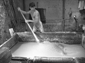 筍料在木槽內(nèi)經(jīng)攪拌變成細(xì)嫩的紙漿