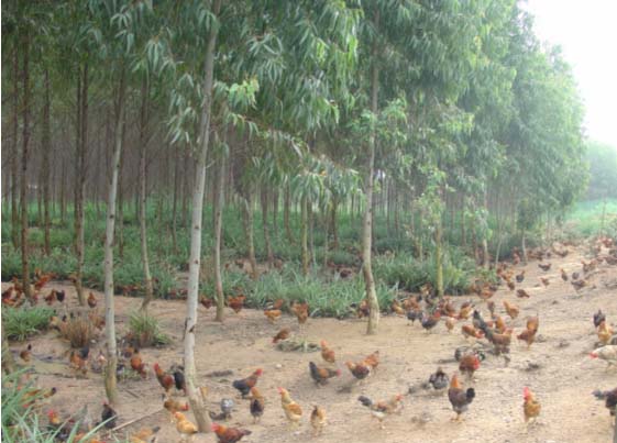 (圖為海南金華林業(yè)有限公司桉樹林地內(nèi)一群文昌雞在林間啄食)