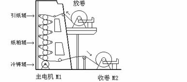 超級壓光紙簡稱SC紙,以價格低廉的磨木漿、化學機械漿或廢紙脫墨漿以及麥草漿為主要原料,配以少量的長纖維化學漿,并添加30%以上的填料制成,其平滑度達 500S以上,不透明度達85%以上,裂斷長縱橫平均達3000m以上,其質量可和低定量涂布紙比美,可用作廣告、目錄、插頁等彩色印刷。由于該工藝使用大量填料和高得率的磨木漿或化機漿,可節(jié)省纖維和木材資源,因此可大大降低成本。紙頁經壓光機壓光后,可以提高紙頁的平滑度、光澤度和緊度,使紙頁全幅厚度一致,從而改善紙張的外觀質量,并減少透氣度。圖一所示的超級壓光機主要分為放卷裝置(又稱退紙器)、壓光輥裝置(含主電機)和收卷裝置等。原紙從放卷裝置處經引紙輥依次通過各紙粕輥和冷鑄輥后進入中心收卷。本文論述的就是如何采用變頻控制來完成超級壓光機的傳動控制。
