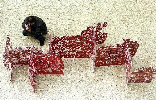 12月22日,一位攝影愛好者在拍郭梅花的剪紙作品。當(dāng)日,郭梅花剪紙藝術(shù)精品展在太原山西省文聯(lián)大廈展廳舉行。郭梅花從小就喜歡畫畫、剪紙,是山西著名的民間剪紙藝術(shù)家。 新華社記者江宏景攝