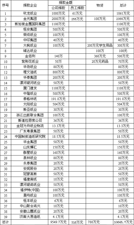 造紙行業(yè)抗震救災愛心捐贈最新進展(更新中)