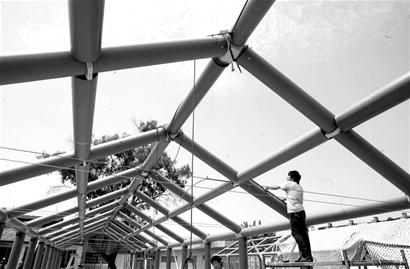 22日下午,成都成華區崔家店華林小學。校園的右側,不少人正在施工。烈日下,初露線形的新教室結構十分獨特,因為整個建筑主體材料采用的都是紙管。再隔幾日,中國首套紙管教室將在這里落成,孩子們將在紙教室里讀書三年。