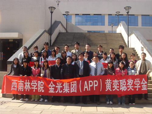 2009年4月2日,西南林學(xué)院舉行金光集團(tuán)黃奕聰獎(jiǎng)學(xué)金頒發(fā)儀式,西南林學(xué)院黨委副書記劉蒼山等領(lǐng)導(dǎo)和APP中國(guó)林務(wù)外宣部總監(jiān)蔣伏利、處長(zhǎng)任文斌出席頒獎(jiǎng)大會(huì),為獲得首屆黃奕聰獎(jiǎng)學(xué)金的30位西南林學(xué)院學(xué)子頒發(fā)獎(jiǎng)金和榮譽(yù)證書。結(jié)合本次獎(jiǎng)學(xué)金頒發(fā)儀式,APP中國(guó)林務(wù)外宣蔣伏利總監(jiān)和任文斌處長(zhǎng)還就循環(huán)經(jīng)濟(jì)促進(jìn)法和林漿紙一體化綠色循環(huán)經(jīng)濟(jì)發(fā)展模式這一議題為西南林學(xué)院學(xué)子作了專題講座。
