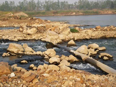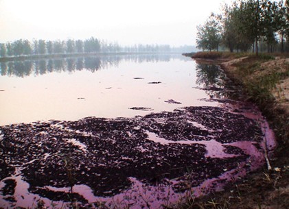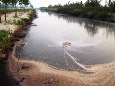 距灤河邊東100多米處,有一約10000多平方米南北長方形污水塘,中間就是排污口。污水塘周圍設(shè)了幾處閘門,打開閘門污水向林地四面八方流去