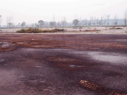 “三北防護(hù)林”內(nèi)大片污水成湖,黑醬油一樣的污水翻騰,漂浮著紅黑色泡沫,散發(fā)出陣陣惡