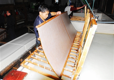 在陳曉東的解說下,我們看到,幾十平方米的作坊內,幾個中年男子站在池邊,手里都拿著一個木框竹篩似的工具,嫻熟地在一池渾水中倒騰著,然后提起放在旁邊,有技巧地一掀,一張濕漉漉的黃色薄膜似的東西便落了下來,就這樣逐步堆成了一垛。陳總說,這項工序勞動強度最大,全憑雙手感覺,眼睛關注,才能撈出高質量的紙張,每人一天可以撈1000張左右。因此,撈紙是整個手工造紙中難度最大的工序,也是最辛苦的工序。