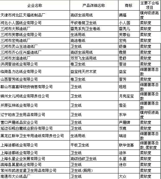 2010年衛生紙產品質量國家監督專項抽查不合格產品及其企業名單