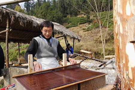 “現(xiàn)在只有7戶咯!以前,新元一個寨子30多家,家家都靠這生活!贝迕裰芾^才看著手中的澆紙工具對記者說,“據(jù)我家公(祖父)回憶,他的前兩輩就已經(jīng)會造紙了,這樣一算,新元做皮紙至少有5代人以上的歷史。”