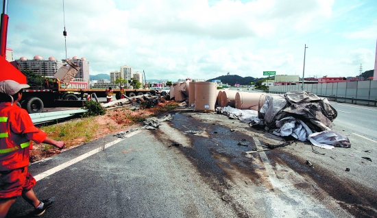 事發后,高速交警趕到現場處理。事發路段高速路A道只剩下緊急停車帶可以通行。昨日上午10點30分左右,現場基本清理完畢,高速路恢復正常通行。