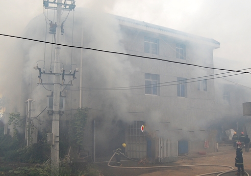 上午8時10分接到報警后,青原大隊官兵出動3輛消防車、20名官兵火速趕往現場。由于是紙箱廠起火,遠遠就能看到園區上空濃煙彌漫。火災現場位于一幢三層小樓內,一樓倉庫成了火海,肆虐的火舌透過窗戶不斷往外噴,毗鄰的一家電子廠岌岌可危。當時,紙箱廠職工拿著水桶、臉盆自救。據該廠負責人介紹,廠房二樓是職工宿舍,不清楚是否有人被困。