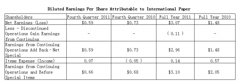 近日,國際紙業(International Paper)公布了其2011年全年的凈利潤報告,根據該報告顯示,國際紙業2011年全年的凈利潤達到了13億美元。對比2010年,國際紙業在2011年的利潤可謂實現了巨幅增長,根據資料顯示,國際紙業在2010年的凈利潤僅為6.4億美元。
