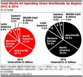 根據(jù)eMarketer和Starcom MediaVest Group (SMG)發(fā)布的全球廣告報告,中國將在2013年成為全球第二大的廣告市場,并將在接下來的一年成為全球第二大的數(shù)字廣告市場。得益于當?shù)鼗ヂ?lián)網(wǎng)和移動互聯(lián)網(wǎng)用戶的高速增長,以及數(shù)字廣告支出的旺盛增加,亞太地區(qū)的廣告市場將在2014年超越美國。