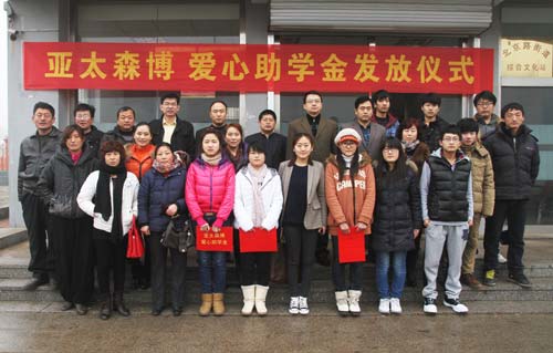 2013年1月30日,山東亞太森博漿紙有限公司在該公司捐建的社區活動中心舉行第四屆愛心助學金頒發儀式。儀式結束后,亞太森博工作人員來到北京路街道周邊社區,為社區貧困居民送上春節慰問金。本次助學金和慰問金惠及周邊9個行政村,26名貧困學子和200個貧困家庭,共計12萬元。