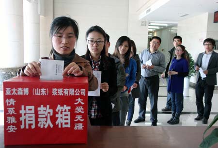 4月26日,亞太森博(山東)漿紙有限公司組織員工為四川雅安地震災(zāi)區(qū)進(jìn)行捐款,員工踴躍參加。這是繼新加坡金鷹集團(tuán)主席陳江和及旗下亞太森博(山東)在雅安地震第一時(shí)間捐款2000萬(wàn)元之后,該公司員工的又一次愛心奉獻(xiàn)。