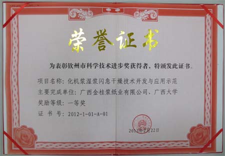 近日,廣西欽州市市委、市政府在市文化藝術(shù)中心隆重召開重大項(xiàng)目、重大活動(dòng)表彰大會(huì),總結(jié)成功經(jīng)驗(yàn),表彰獎(jiǎng)勵(lì)先進(jìn)廣西金桂漿紙業(yè)有限公司的“化機(jī)漿濕漿閃急干燥技術(shù)開發(fā)與應(yīng)用示范”作為欽州市重大項(xiàng)目,獲得了“欽州市科學(xué)技術(shù)進(jìn)步獎(jiǎng)一等獎(jiǎng)”的榮譽(yù)稱號(hào),欽州市市長(zhǎng)李新元向金桂公司代表頒發(fā)了獲獎(jiǎng)榮譽(yù)證書。