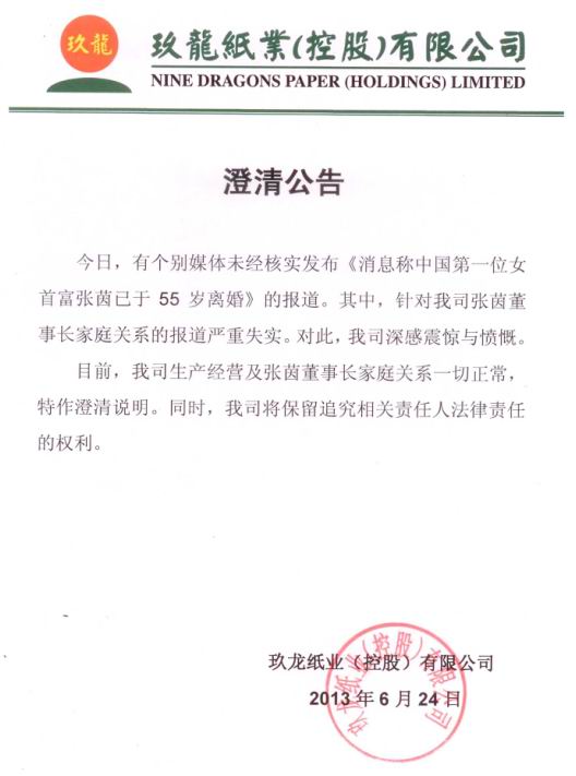 針對此報道,玖龍紙業(yè)今日中午在港交所發(fā)布公告,否認了這一事實。公告稱,董事會已咨詢張茵及劉名中,獲通知媒體報道為錯誤及完全不正確,并稱媒體對他們婚姻的評論為沒有事實根據(jù)及嚴重失實。
