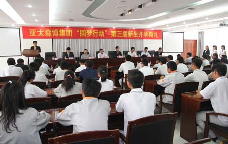 9月27日,亞太森博集團2013級“圓夢行動”新生開學典禮在日照職業技術學院舉行。日照市教育局、日照市外僑辦、日照經濟技術開發區、南京林業大學、日照職業技術學院、新加坡金鷹集團、亞太森博(山東)漿紙有限公司的有關領導及46名新生出席了典禮。