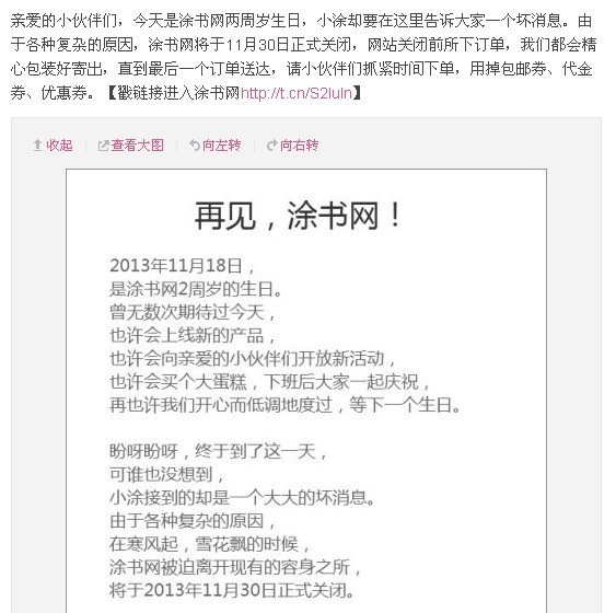 2013年11月18日,在涂書網兩周年生日之際,涂書網卻在其網官方微博發消息稱,“由于各種復雜的原因,涂書網將于11月30日正式關閉。”微博表示,網站關閉前所下訂單,涂書網都會精心包裝好寄出,直到最后一個訂單送達。這無疑是一爆炸性消息。