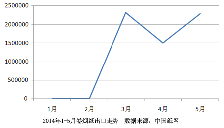 2014年1-5月,我國卷煙紙累計出口9384.5噸。其中,3月份出口2315.5噸,4月份出口1504.2噸,5月份出口2288.7噸。與去年前5個月累計出口11539.2噸相比,減少2154.7噸。