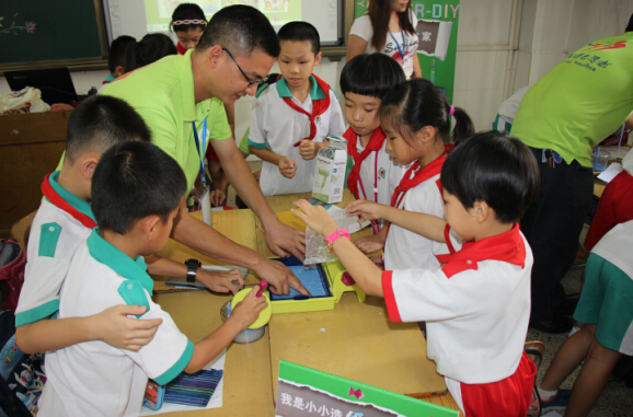 “我是小小造紙家”活動是亞太森博(廣東)志愿者協會的一個品牌活動,類似的活動已經多次在新會區各個學校舉辦。志愿者們通過DIY造紙機,指導小學生經過通過鋪漿、成型、壓榨、烘干等一道道工序,將一張張廢紙變成新的紙張,目的是向孩子們傳授環保理念。