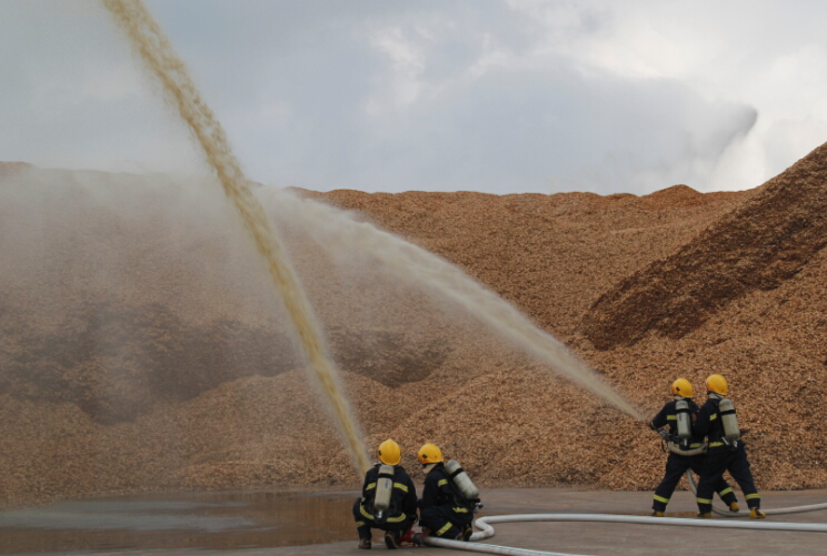 上午10時許,廣西金桂公司各部門代表、工安干事以及包商作業人員共200余人齊聚中控樓前,參加由港區消防大隊專業消防人員進行的滅火知識培訓,消防人員在現場演示了滅火器、消防栓等器材的使用要領,發放了消防安全知識宣傳單,最后由參訓人員進行滅火技能實踐操作。隨后,在公司木片堆場進行了突發事故滅火演習,情景假設堆場因鏟車操作不當與地面摩擦,火星引燃干燥木片,造成火勢蔓延,公司消防隊在試圖滅火時人力不足,即向港區消防大隊請求支援,港區消防大隊接警后迅速出動趕赴現場,與公司消防、醫護及現場作業人員協調聯動,最終成功撲滅火災,解除險情。