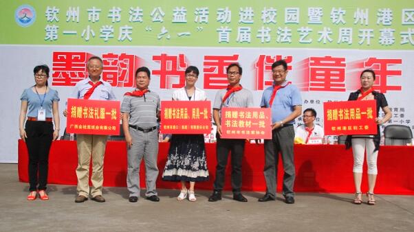 6月1日,欽州市書法公益活動進校園暨欽州港區(qū)第一小學慶“六一”首屆書法藝術周活動隆重開幕,廣西金桂漿紙業(yè)有限公司在開幕式上向港區(qū)一小捐贈一批價值1萬元的書法禮服,用于支持開展書法藝術活動,推動書法特色學校建設,也為小朋友們送上節(jié)日的祝福。
