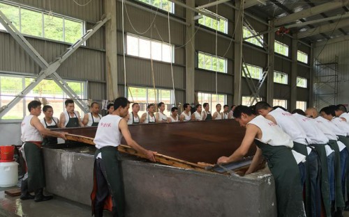 一推、一拉、一蕩……“一二!起!”伴著44名漢子有力的號子,一張長11米寬3.3米的世界上最大宣紙的雛形便完成了。