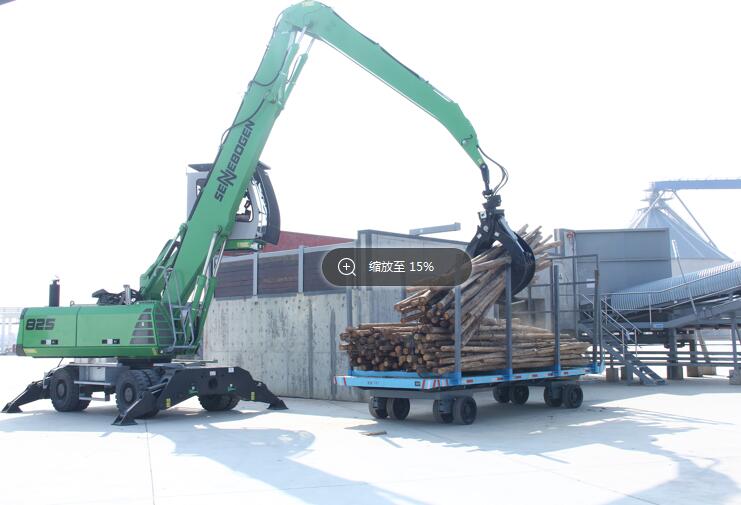 抓木機把桉樹原木投入木材接收平臺進行清洗及切片準備