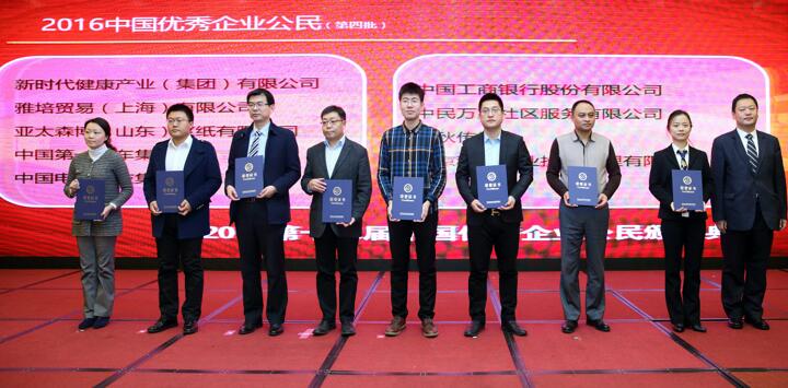 12月10日,2016第十二屆中國優秀企業公民年會在北京舉行。年會對本年度在社會責任方面做出突出貢獻的企業、團體、個人及優秀項目等進行了表彰。亞太森博集團憑借在社會責任方面的勇于擔當和突出成績被評為“2016中國優秀企業公民”。該集團董事長李建紹做了主題演講,從業務模式創新、循環經濟及環保推廣創新、社區工作創新等方面介紹了企業社會責任的創新實踐。
