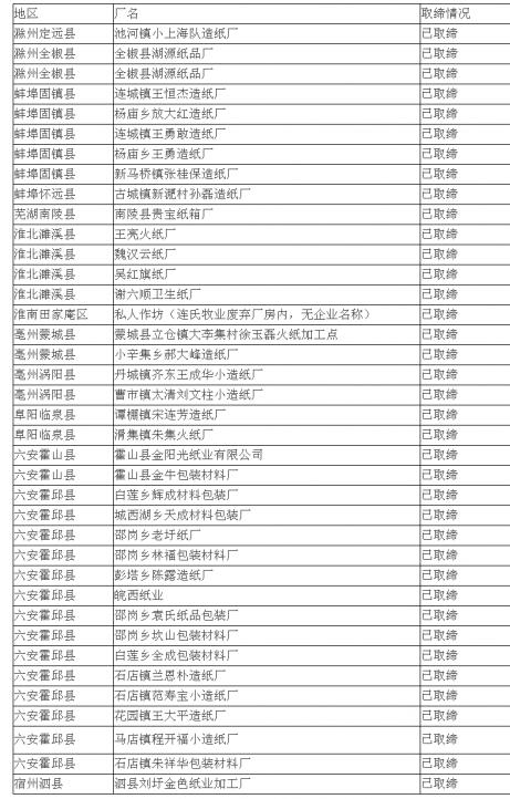 安徽省造紙十小企業取締名單: