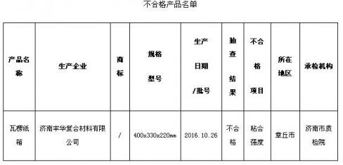 2016年第4季度,濟南市質量技術監督局組織開展了瓦楞紙箱(紙板)產品質量市監督抽查。本次共抽查了全市32家企業生產的61批次產品。抽查發現有1家企業的1批次產品不符合相關標準的要求,不合格項目涉及“粘合強度”等。